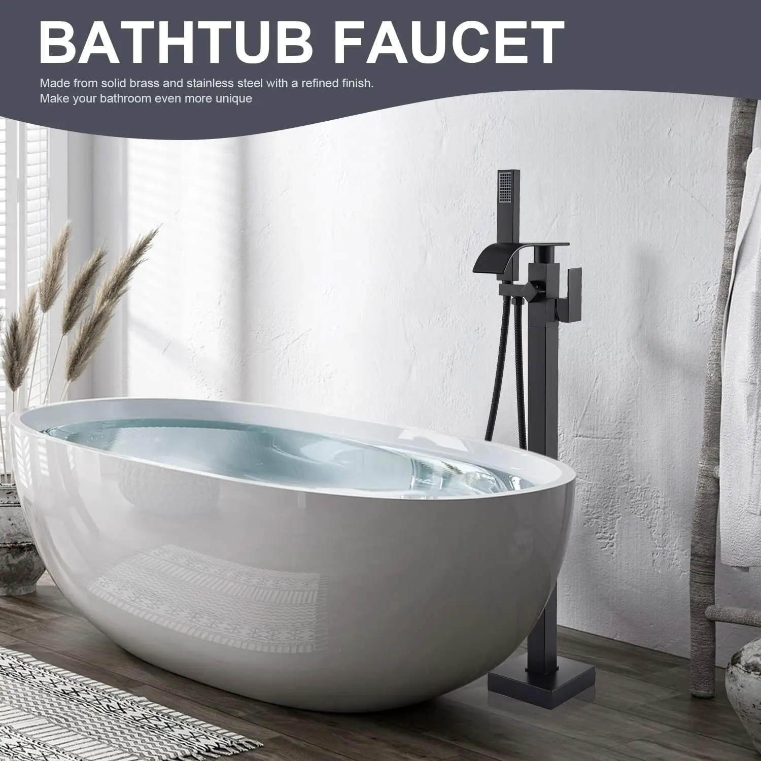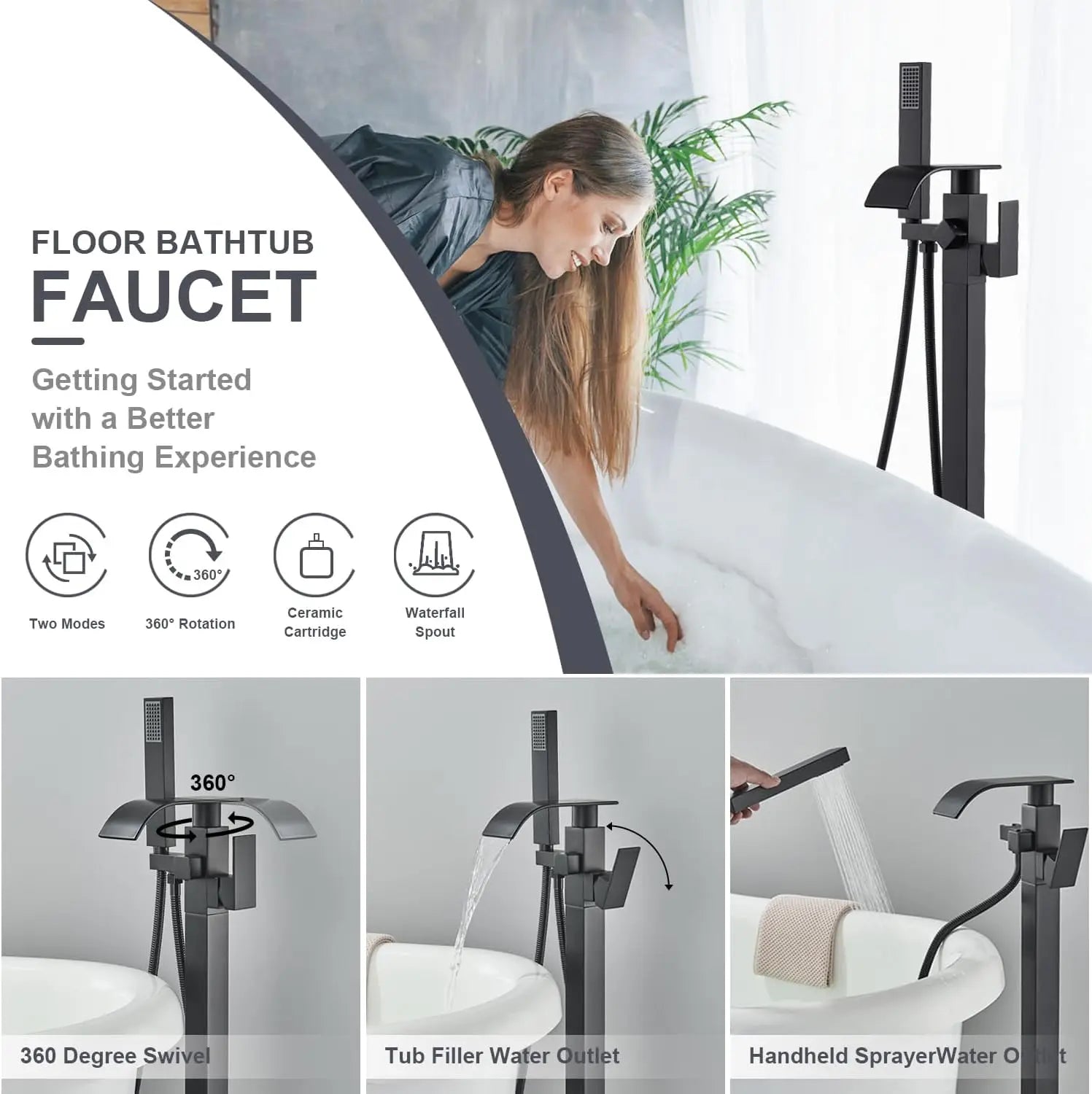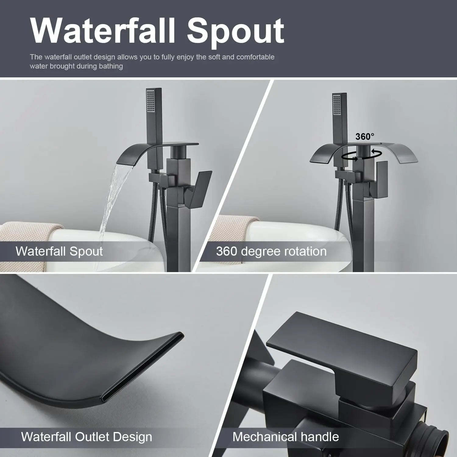 Black Waterfall Free Standing Tub Faucet Floor Tub Filler Faucet Brass Bathroom Tub Faucets with Hand Shower