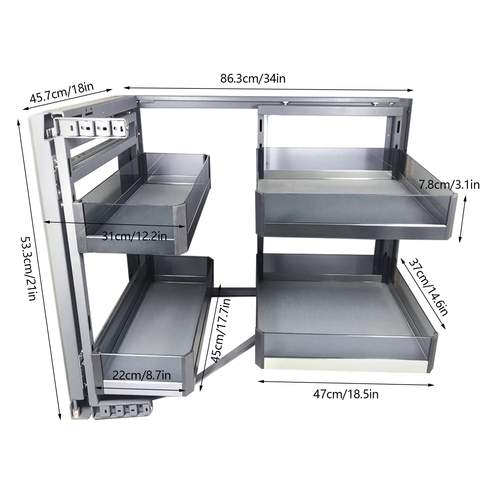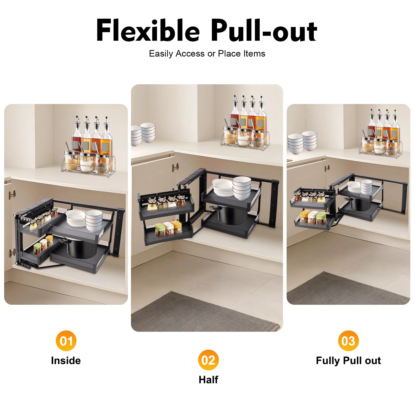 - Maximize wasted cabinet corners with a 270° swing-out design that brings your pots, pans, and jars within easy reach, without crowding counters.