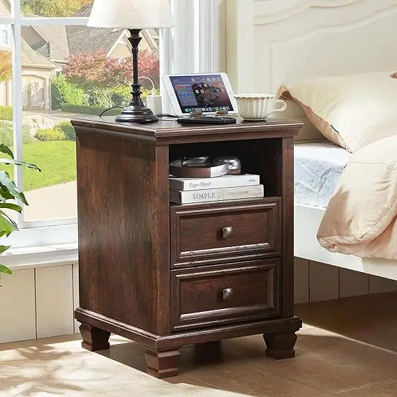 - [Enough Storage Space]: The vintage wooden nightstand measures 18”W * 18”D * 25”H inches when fully assembled. This bedside table offers ample storage space for your essentials. It features 1 open storage shelf for books, decor, or other items, along with 2 spacious drawers to help keep your space organized. Great for use as bedside tables in the bedroom or end tables in the living room.
