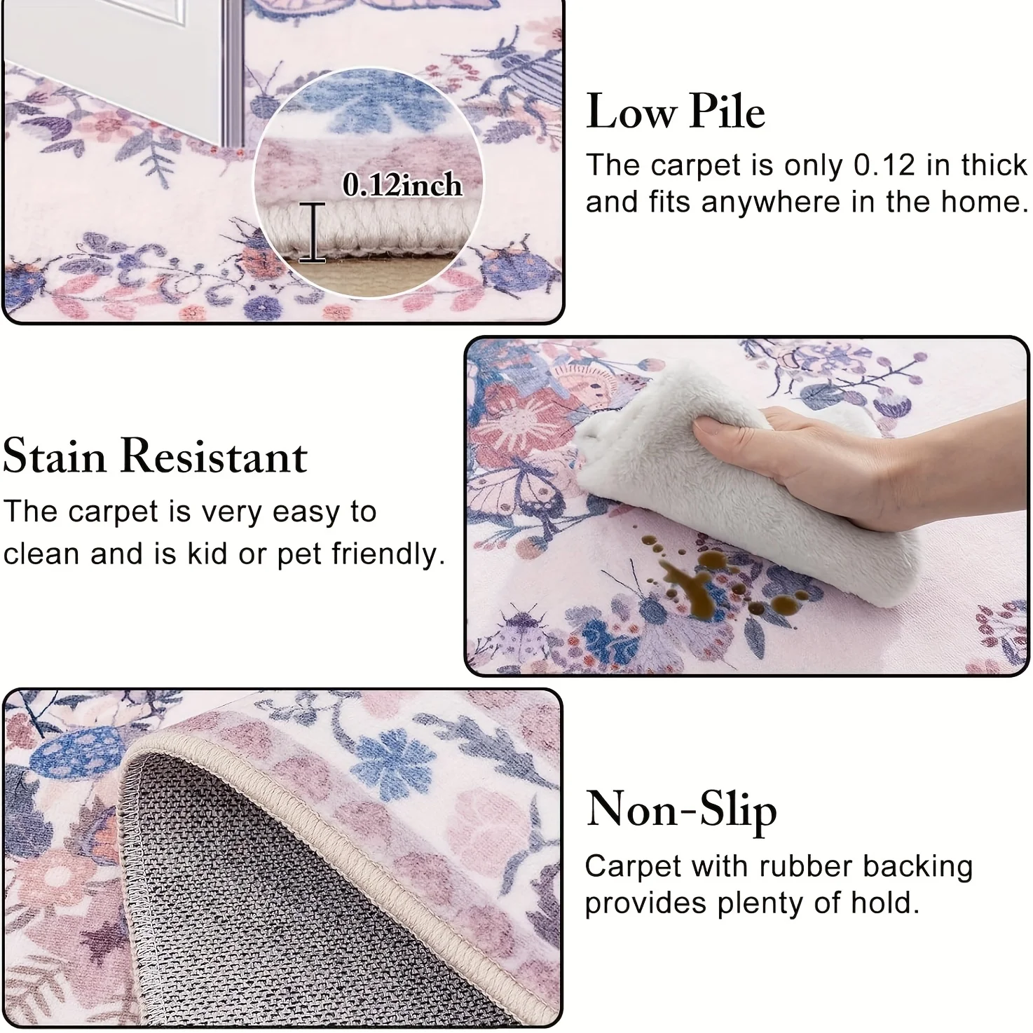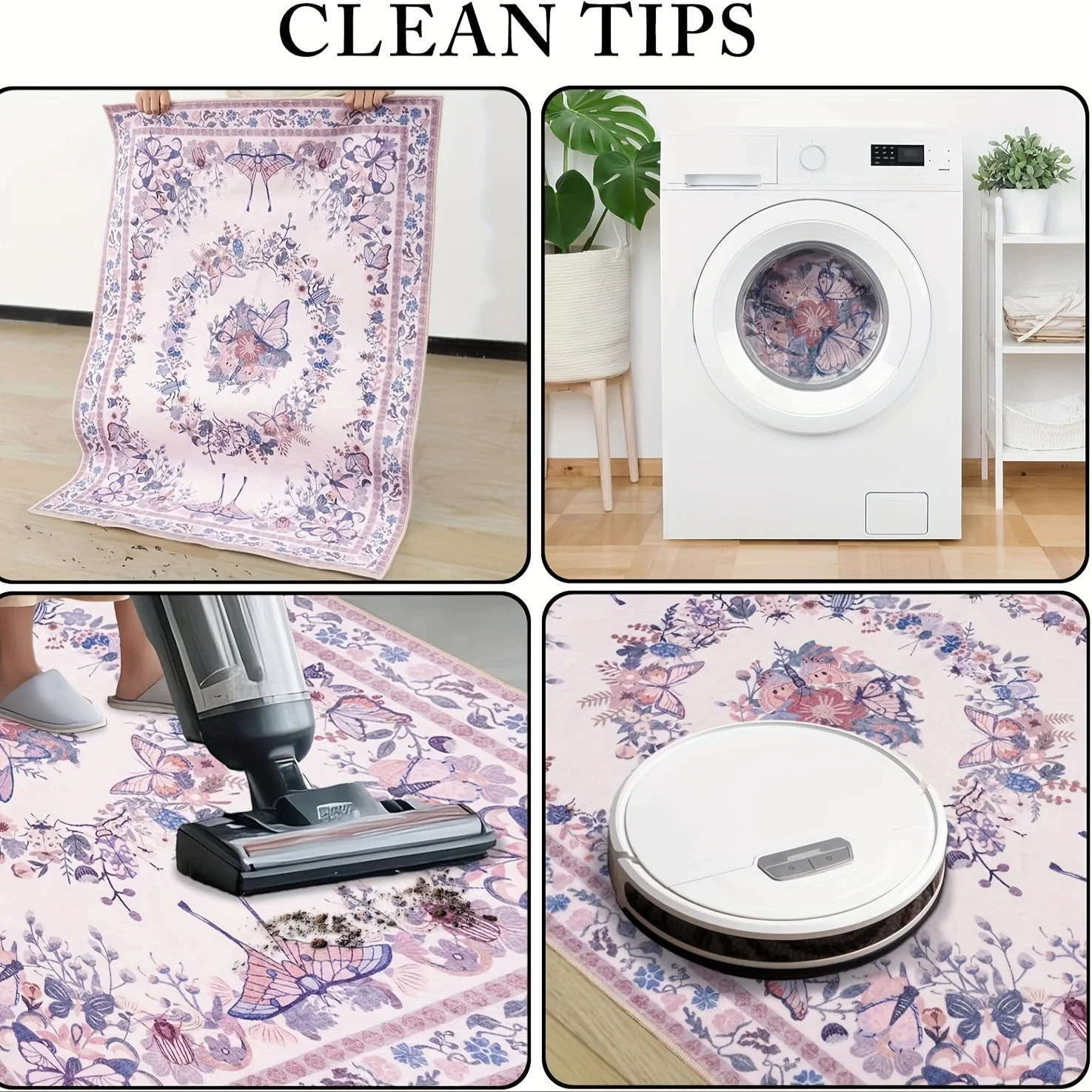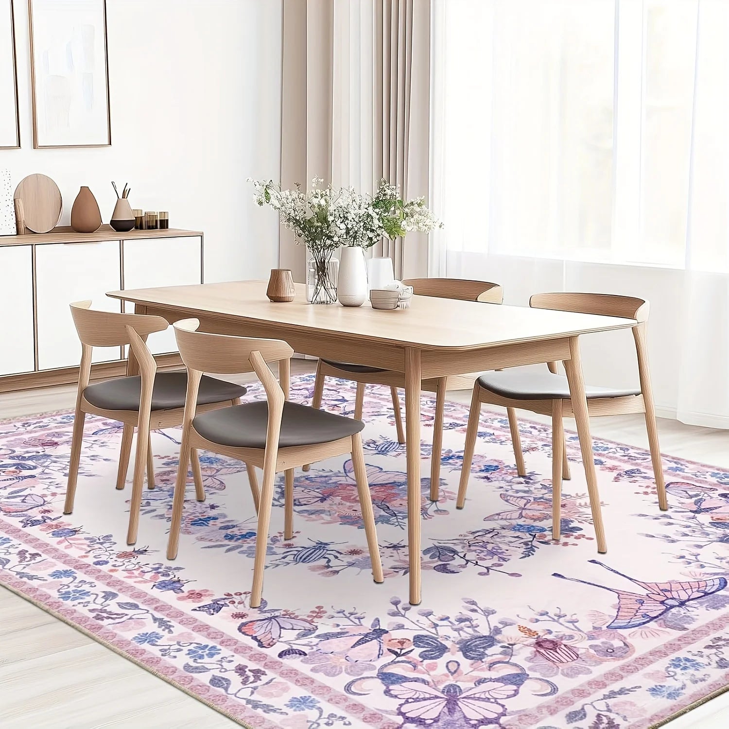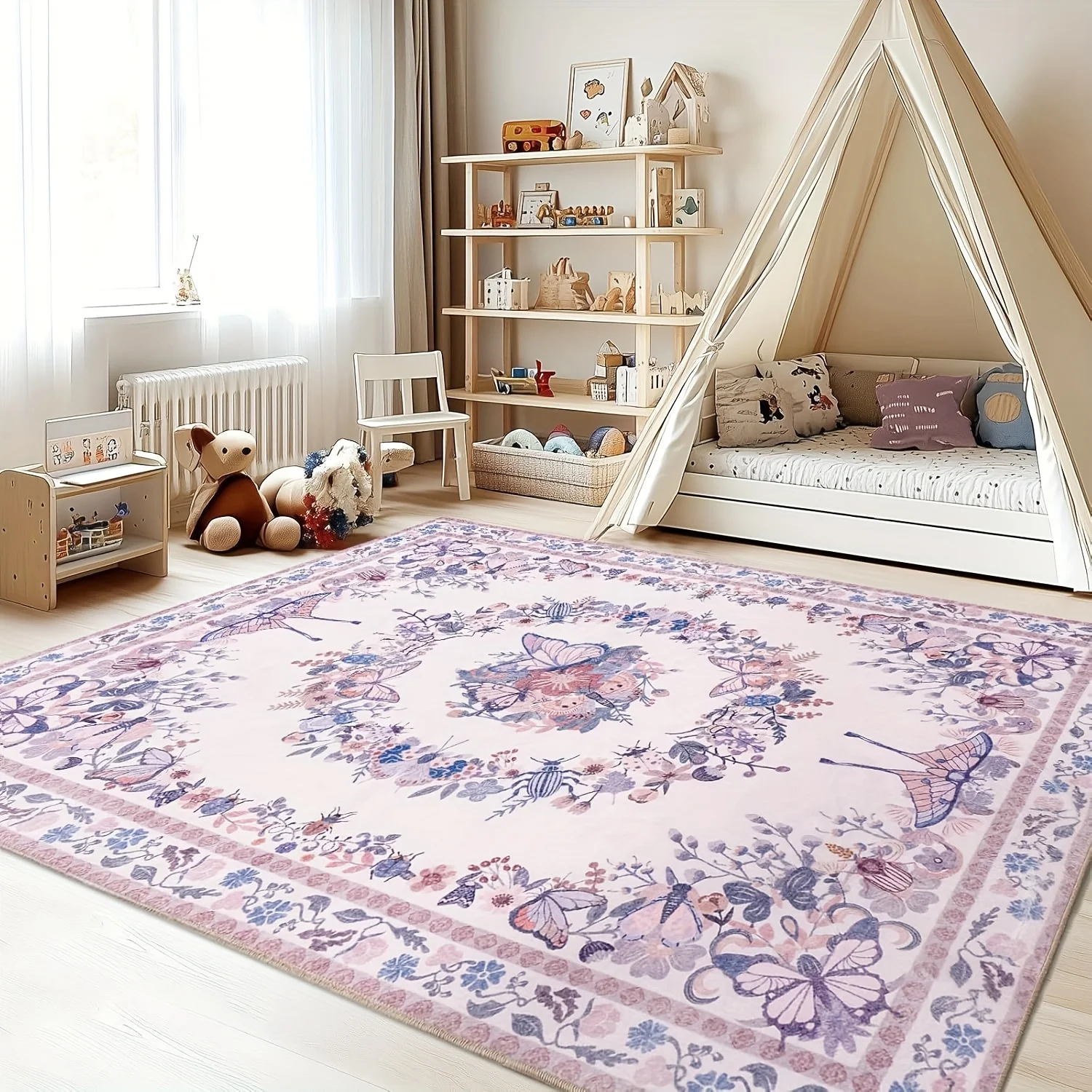 Gnizama Pink Butterfly Living Room Large Area Rug, Washable Vintage Floral Living Room Rug, Bedroom Large Area Rug